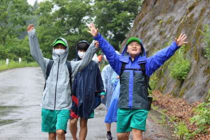 雨が降る中、班員と励まし合いながら自分が決めた距離を全員が歩ききりました。